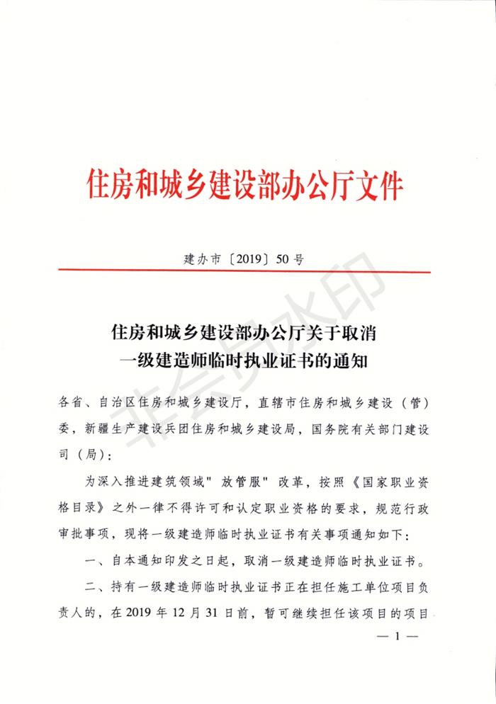 附件:住房和城鄉(xiāng)建設(shè)部辦公廳關(guān)于取消一級(jí)建造師臨時(shí)執(zhí)業(yè)證書的通知(建辦市〔2019〕50號(hào))